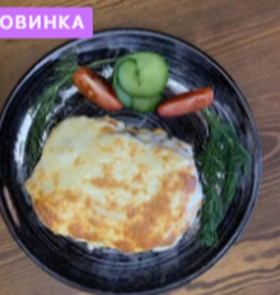 Состав: Бифштекс из филе курицы, с шампиньонами и помидорами, запеченный под нежной сырной шапкой с легким вкусом майонеза