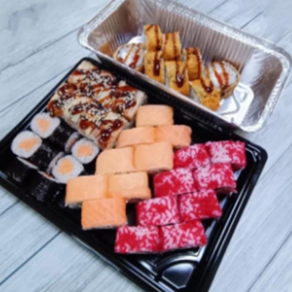 Состав: Токио, Калифорния с угрём, Филадельфия оригинальная, Сяки маки, Сегун горячий, имбирь, васаби, соевый соус.